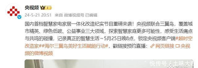 2024年5月21号晚上20:51,央视频发布音信: 国内首档智谋家电家居一体化更始纪实节目重磅来袭!央视频聚集三翼鸟,隐蔽城市精英、绿色低碳、公益行状三大限制,探索智谋家庭更多可能性,感受活命痛点与共识的碰撞,纪录实在的智谋活命~5月25日晚8点,锁定央视频客户端